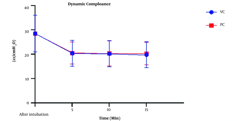 The peak airway pressure was compared, as shown in Figure 2. Airway pressure increased in both types of ventilation with insufflation of CO2 into the abdominal cavity. The ANOVA test showed a significant intra-group increase of this variable (P < 0.001); however, this difference was not significant between the VCV and PCV groups (P = 078). The mean dynamic compliance was 28.55 ± 7.54 cc/cmH2O before pneumoperitoneum but decreased to 20.15 ± 5.36 in the VCV group and 20.43 ± 4.77 in the PCV group after pneumoperitoneum. This decrease was significant in both groups compared to the baseline (P < 0.001), but there was no statistically significant difference between the two types of ventilation (P = 0.92) (Figure 3). Expiratory tidal volumes were 482.25 ± 67.2 and 483.02 ± 69.6 cc during VCV and PCV, which did not differ significantly (P = 0.812), almost equivalent to the ideal TV calculated for patients.