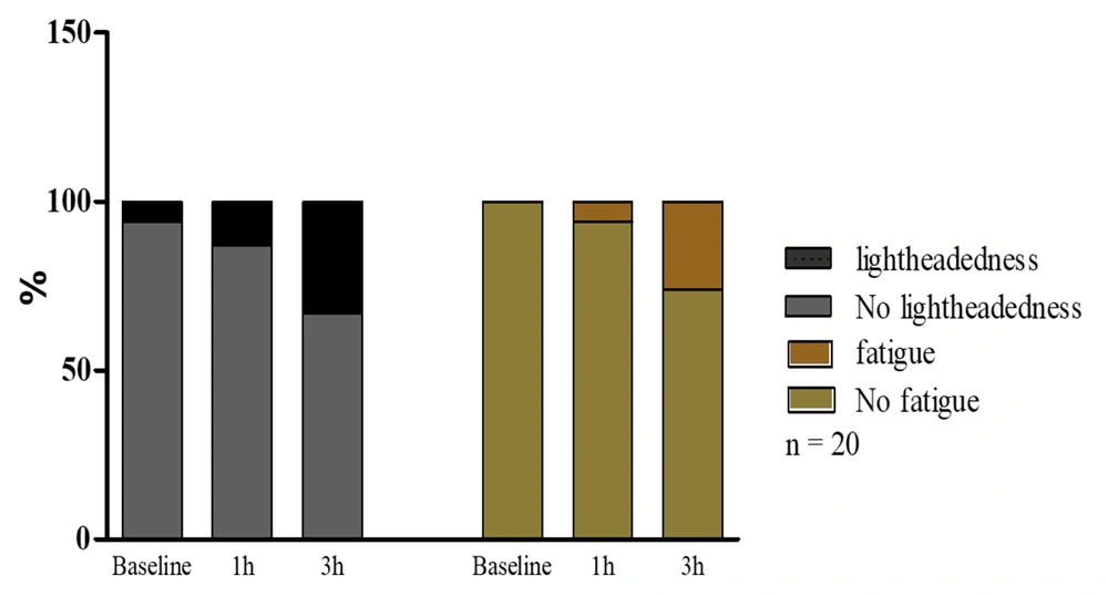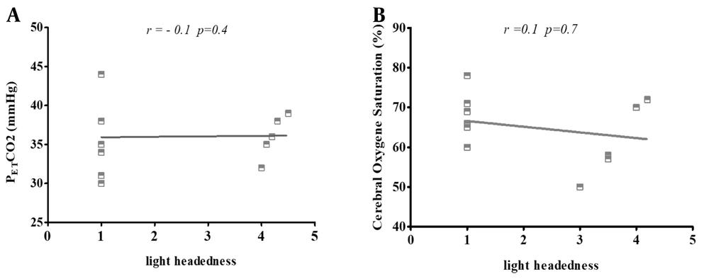 Based on the previous study, rSO2 and PETCO2 can contribute to fatigue and lightheadedness. The correlation of lightheadedness with PETCO2 and rSO2 in the present study was insignificant, although a correlation existed. This may be due to the number of studied cases, which were insufficient for correlation analysis (33, 34).
