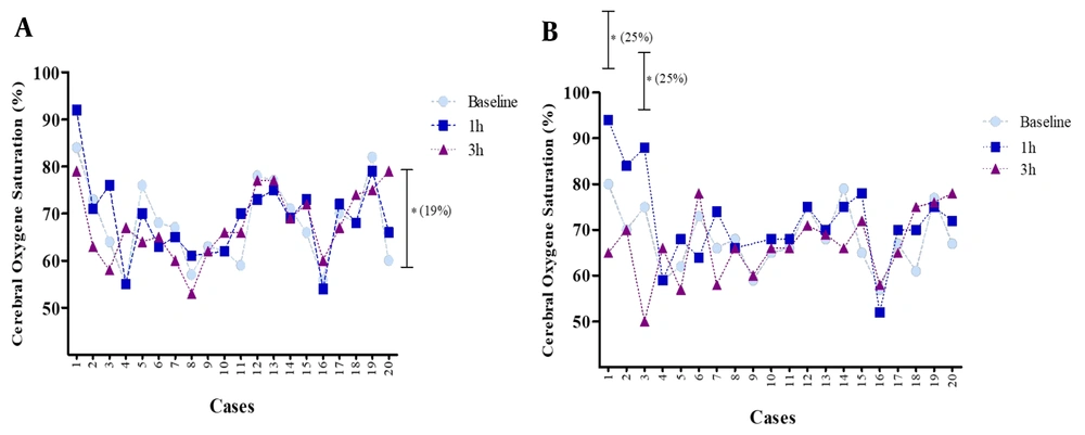 The mean rSO2 for the right and left parts of the brain following 3 h of using a mask showed no significant change (more than 20%) compared to the baseline (0 h) (Figure 4). The mean rSO2 right side at baseline was 68% (55.0 - 82.0), which rose to 69% (55.0 - 92.0) after 1 h and decreased to 68% (53.0 - 79.0) after 3 h of mask-wearing. Regarding the left side of rSO2, the mean value at baseline was 68% (59.0 - 80.0), which rose to 72% (52.0 - 94.0) after 1 h and decreased to 67% (50.0 - 78.0) after 3 h of mask-wearing. An increase in rSO2 (less than 20%) on the right side after 3 h compared with the baseline (0 h) was evident for some other individuals. Measurement of rSO2 on the right side for a volunteer at baseline was 84%, which rose to 92% after 1 h and decreased to 79% after 3 h of mask-wearing. Further, a few subjects who experienced a remarkable change showed a decrease in rSO2 (more than 20%) in the left side of the brain compared to the baseline.