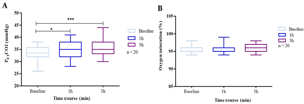 A, end-tidal carbon dioxide partial pressure (PETCO2); B, oxygen saturation (SaO2), at baseline, 1 h after, 2.5 h after. The exercise test was performed by 20 subjects with N95 masks. Box plots represent the changes in the oxygen saturation and carbon dioxide due to mask use. The results are presented as cases that used masks. The whiskers represent the local maximum and minimum values; each box's horizontal line represents the median. Differences were considered 'tendentially significant' (*) with P-values of 0.1 - 0.05 and 'highly significant' (***) with P-values < 0.005.