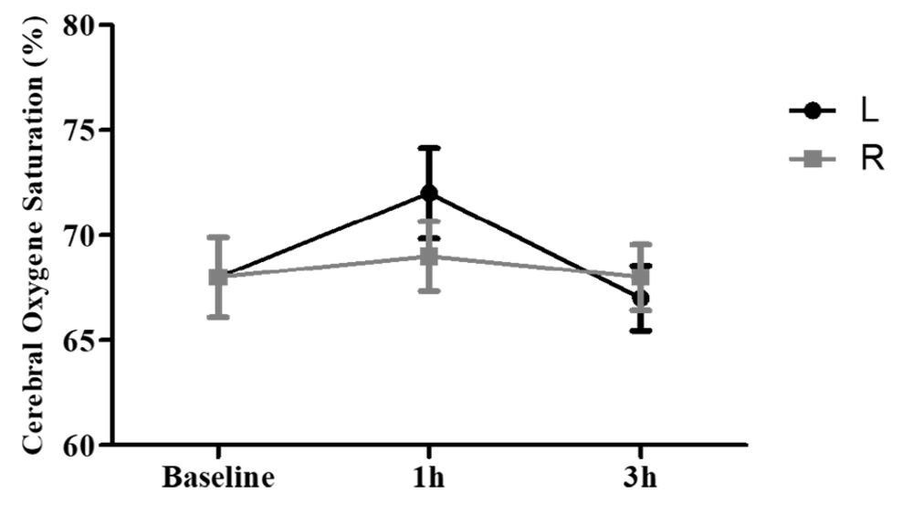 The parameters of right-sided and left-sided rSO2 showed different patterns. In the first hour of mask-wearing, we saw an increase in right and left-side rSO2 of the brain; however, the increase in rSO2 on the left side was higher compared to the baseline, which was more than the amount of rSO2 on the right side of the brain. Normally, differences of up to 10% in cerebral oxygenation between the left and right hemispheres are apparent, especially during unstable arterial saturations, which may indicate uneven cerebral oxygenation (1).