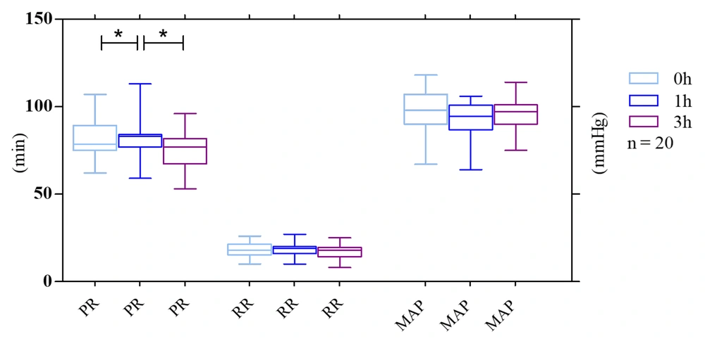 Furthermore, the baseline RR was 18 (10.0 - 26.0) rpm vs. 18.0 (10.0 - 27.0) rpm after 1 h and 17.0 (8.0 - 25.0) rpm after 3 h. The results showed a decrease in RR, but not significantly after 3 h compared to the baseline.