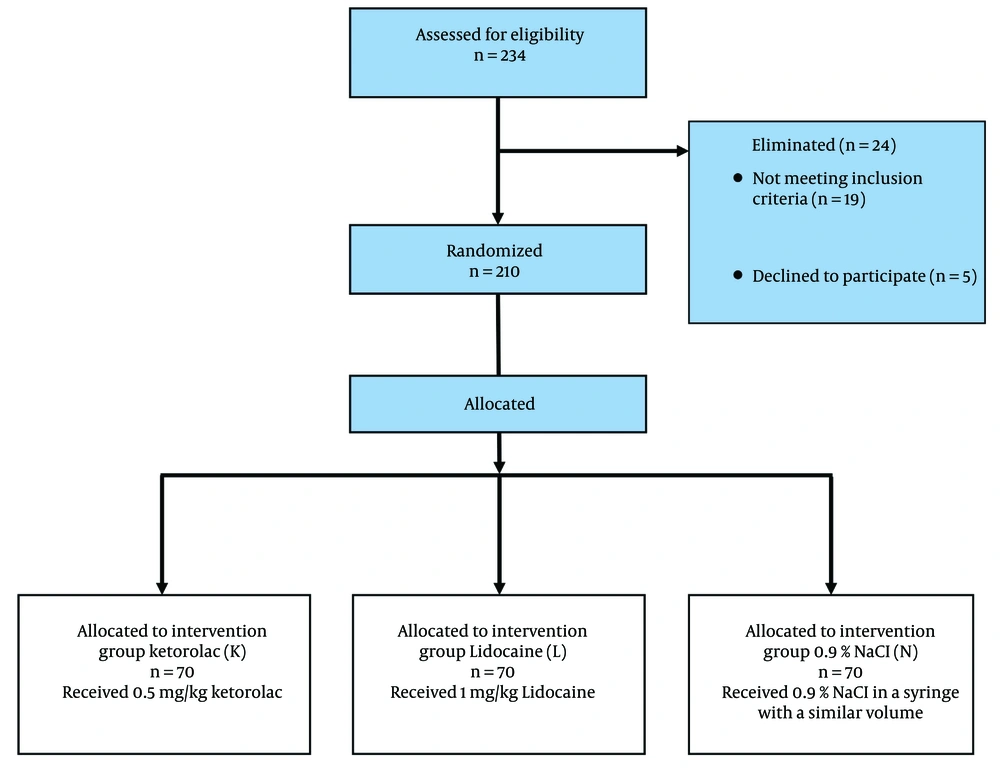 Patients received either 0.5 mg/kg ketorolac (group K), 1 mg/kg lidocaine (group L), or saline 0.9% (group N), in a syringe with a similar volume, injected through the three-way connector over 15 seconds, 3 minutes before the administration of fentanyl. After 3 minutes, all patients received 3 mcg/kg intravenous fentanyl within 3 seconds. Then, another anesthesiologist, unaware of the group assignments, recorded the onset and intensity of coughing within three minutes after the fentanyl injection. The patients were also kept unaware of the pretreatment medication. Cough severity was graded based on frequency: Mild (1 - 2), moderate (3 - 4), severe (5 or more) (12, 13). The mean arterial pressure (MAP), HR, and SpO2 were recorded before the administration of ketorolac, lidocaine, and normal saline (T0), 3 minutes after the administration of fentanyl (T1), and 1 minute after tracheal intubation (T2). If SpO2 fell below 90% while coughing, assisted ventilation was immediately started. General anesthesia with a similar protocol was administered to all patients after coughing cessation (if it occurred) or 90 seconds after fentanyl injection, consisting of propofol 2 mg/kg and cisatracurium 0.2 mg/kg. After manual ventilation for 5 minutes, intubation and mechanical ventilation were performed.