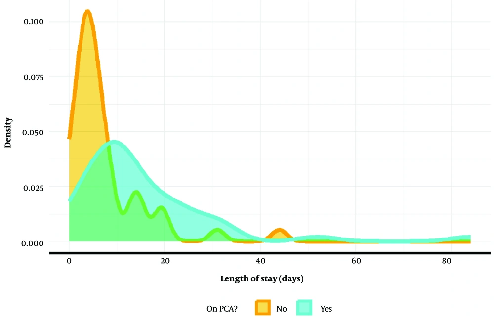 ![Length of stay (LOS) by patient-controlled analgesia (PCA) usage: Negative binomial regression was used to model the relationship between PCA and LOS. Bootstrapping was used to obtain model coefficient estimates, standard errors, and confidence intervals (CIs) through 10,000 iterations. Patients using PCA exhibited a LOS two times greater [incidence rate ratio (IRR) = 2.071, 95% CI 1.375 to 3.12, P < 0.001] than patients who did not receive PCA. Length of stay (LOS) by patient-controlled analgesia (PCA) usage: Negative binomial regression was used to model the relationship between PCA and LOS. Bootstrapping was used to obtain model coefficient estimates, standard errors, and confidence intervals (CIs) through 10,000 iterations. Patients using PCA exhibited a LOS two times greater [incidence rate ratio (IRR) = 2.071, 95% CI 1.375 to 3.12, P < 0.001] than patients who did not receive PCA.](https://services.brieflands.com/cdn/serve/3170f/9ebc1878f603a1092d924b37fac5874ee77b010e/aapm-15-5-162394-i002-preview.webp)