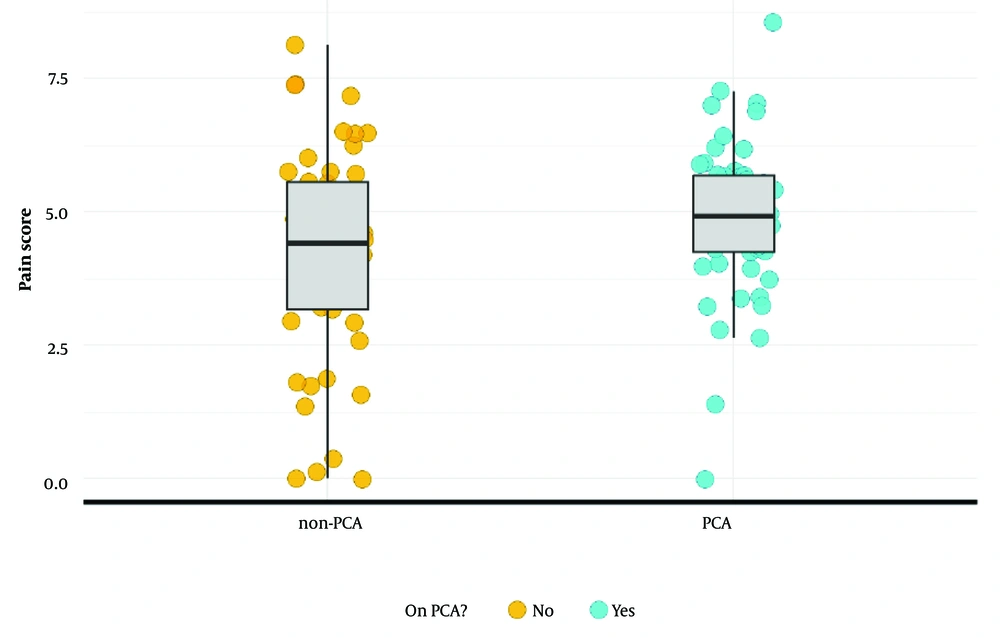 ![Postoperative pain score by patient-controlled analgesia (PCA) usage: Normal regression was used to model the relationship between PCA and post-surgery pain score. Patients using PCA exhibited a pain score two times greater [incidence rate ratio (IRR) = 2.004, 95% confidence interval (CI) 0.999 to 4.017, P = 0.046] than patients who did not receive PCA. Postoperative pain score by patient-controlled analgesia (PCA) usage: Normal regression was used to model the relationship between PCA and post-surgery pain score. Patients using PCA exhibited a pain score two times greater [incidence rate ratio (IRR) = 2.004, 95% confidence interval (CI) 0.999 to 4.017, P = 0.046] than patients who did not receive PCA.](https://services.brieflands.com/cdn/serve/3170f/d1c7a40ac71ef126f5b166787403e2d8dd0f3072/aapm-15-5-162394-i001-preview.webp)