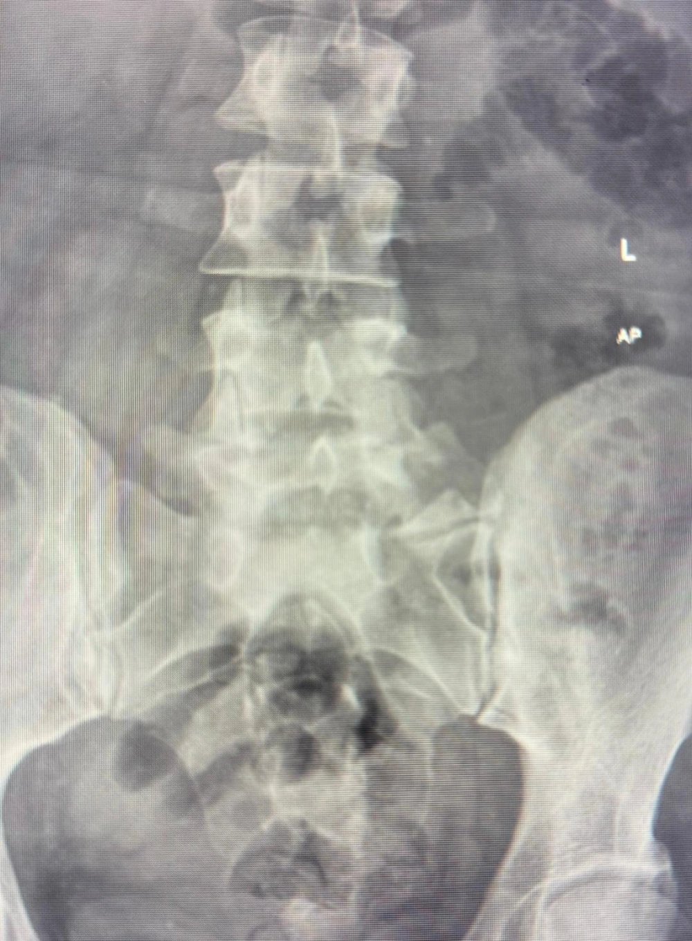 Anteroposterior (AP) view of the lumbosacral (L-S) spine. This image reveals a bifid transverse process on the right side at the L5 vertebral level. In contrast, the left transverse process of L5 appears distinctly enlarged compared to the right side and the transverse processes of the adjacent vertebrae.