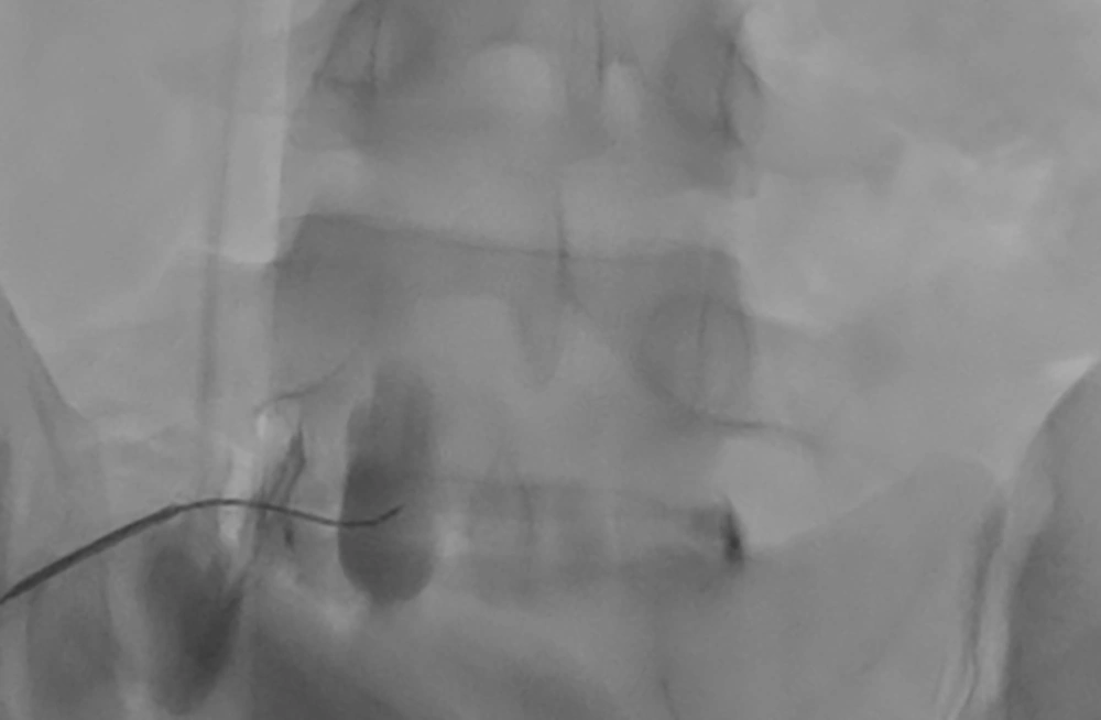 A review of the pre-procedure lumbosacral (L-S) X-rays identified a bifid right L5 transverse process and an enlarged left transverse process (Figure 1). Based on these findings, a right-sided posterolateral approach was selected, with the goal of achieving bilateral spread of contrast. A left-sided trans-discal approach was planned as a contingency in case the attempt resulted in unilateral contrast distribution (7, 8).