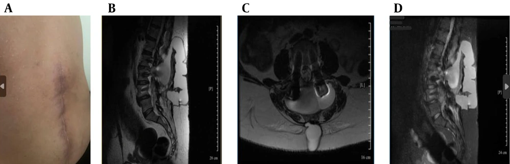 Clinical and magnetic resonance imaging (MRI) findings (A - D): A, postoperative lumbar scar with signs of cerebrospinal fluid (CSF) leak; B, sagittal T2-weighted MRI showing posterior epidural CSF collection; C, axial T2-weighted MRI showing hyperintense fluid posterior to the thecal sac; D, sagittal short tau inversion recovery (STIR) MRI showing cranially extending epidural CSF leak.