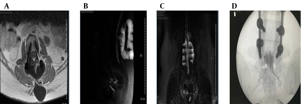 Ongoing symptoms prompted further evaluation. The CT myelography was unavailable, so magnetic resonance (MR) myelography was used instead, revealing an active CSF leak at L4-L5 (Figure 1B - D and 2A), confirmed by contrast extravasation (Figure 2B and C). Given the failure of surgery and conservative therapy, an EBP was indicated. Direct lumbar access was avoided for three main reasons: (1) Postoperative fibrosis and adhesions at L4-L5, (2) risk of cephalad migration reducing efficacy, and (3) procedural difficulty associated with reoperated anatomy. A caudal approach was chosen for broader epidural spread, avoidance of manipulation of the surgical site, and minimizing procedural risks. Informed written consent was obtained from the patient for both the medical procedure and publication of this case report, in accordance with the Declaration of Helsinki. Ethical approval for this work was granted by the Research Ethics Committee of Tehran University of Medical Sciences (IR.TUMS.IKHC.REC.1404.152).