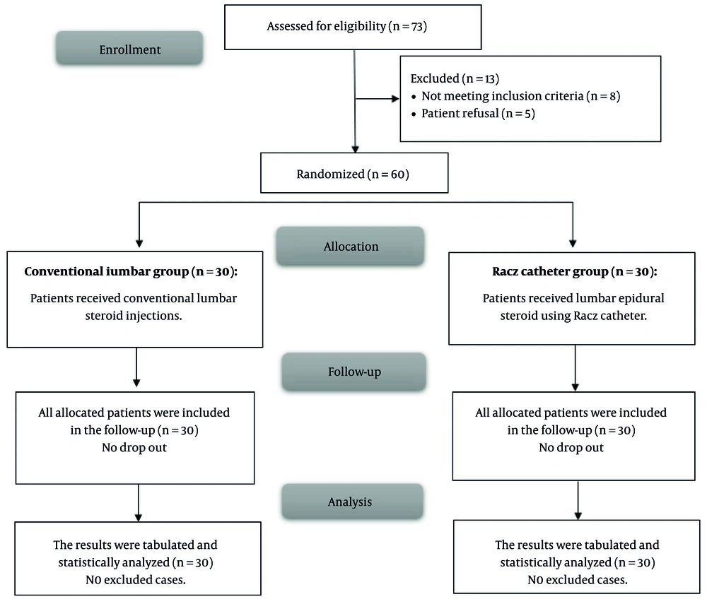 To ensure methodological rigor, patients were randomly assigned using a computer-generated sequence. Each assignment was concealed in a sealed, opaque envelope to maintain allocation secrecy and prevent bias. Participants were split evenly into two groups: One receiving the Racz catheter-assisted lumbar epidural steroid injection, and the other undergoing the conventional technique. Both the patients and the outcome assessors were kept blind to group allocations throughout the study.