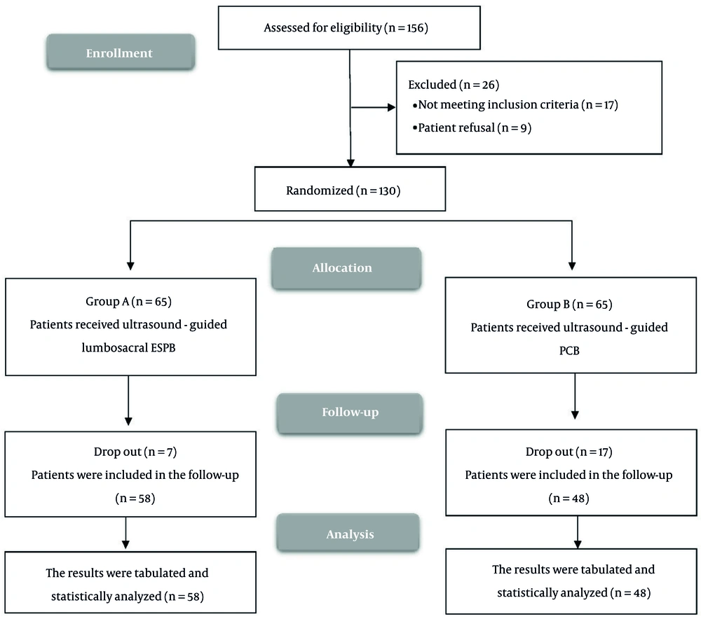 Currently, there is growing interest in peripheral nerve blocks (PNBs) as a safer alternative for anesthesia and pain management in LL surgeries (4). The PNBs provide substantial benefits by improving safety, enhancing efficacy, and accelerating recovery outcomes. The PNBs reduce the risk of respiratory and cardiac complications (5). The psoas compartment block (PCB) is a regional anesthesia approach targeting the main branches of the lumbar plexus (6). The PCB-sciatic nerve block (SNB) combination effectively anesthetizes the entire lower extremities while providing greater hemodynamic stability (7).