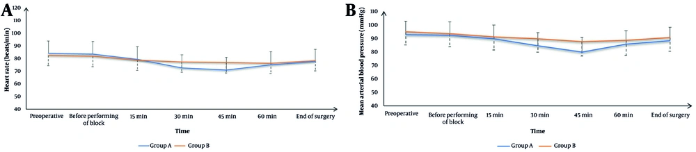 Figure 3 demonstrates that HR and MAP were comparable between the two groups at baseline, before block administration, at 15 and 60 minutes intraoperatively, and at the end of surgery. However, at the 30- and 45-minute intraoperative time points, group A exhibited significantly lower HR and MAP values than group B (P < 0.05).