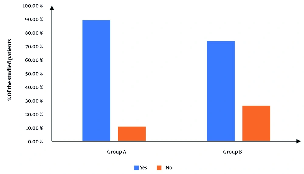 Figure 2 exhibits the procedural incidence of success, which was significantly elevated in group A in contrast with group B (90.77% vs. 76.92%, P = 0.032), yielding a relative risk (RR) of 0.4 (95% CI: 0.17 to 0.97). Cases in which the procedure failed were excluded from subsequent analysis to maintain the integrity of outcome evaluation.