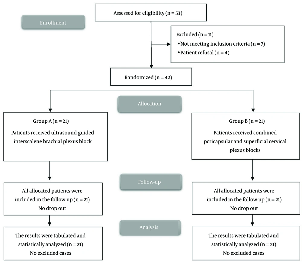 Comprehensive preoperative assessments were conducted for all participants, including detailed patient histories, thorough clinical evaluations, radiological shoulder imaging, and routine laboratory analyses. Participants were educated on the use of an eleven-point Numerical Rating Scale (NRS) (16) for pain assessment, ranging from 0 (no pain) to 10 (worst pain imaginable). Ultrasound imaging was performed using a Mindray system (Shenzhen, China) with a frequency range of 10 - 15 MHz and a 2 - 4 cm depth setting. A curvilinear probe was used for scanning via a low intercostal or subcostal approach, while a linear probe was employed for various block procedures.
