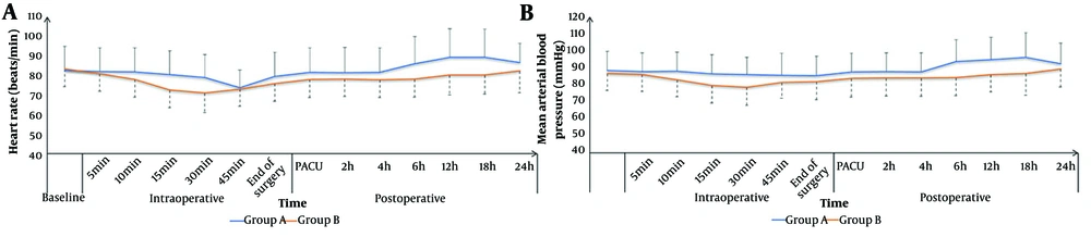 The HR and MAP were not significantly different between the groups at baseline; 5, 10, and 15 minutes intraoperatively; in the PACU; and at 2, 4, and 24 hours postoperatively. The HR and MAP were significantly lower in group B compared to group A at 30 and 45 minutes intraoperatively and at 6, 12, and 18 hours postoperatively (P < 0.05, Figure 2).