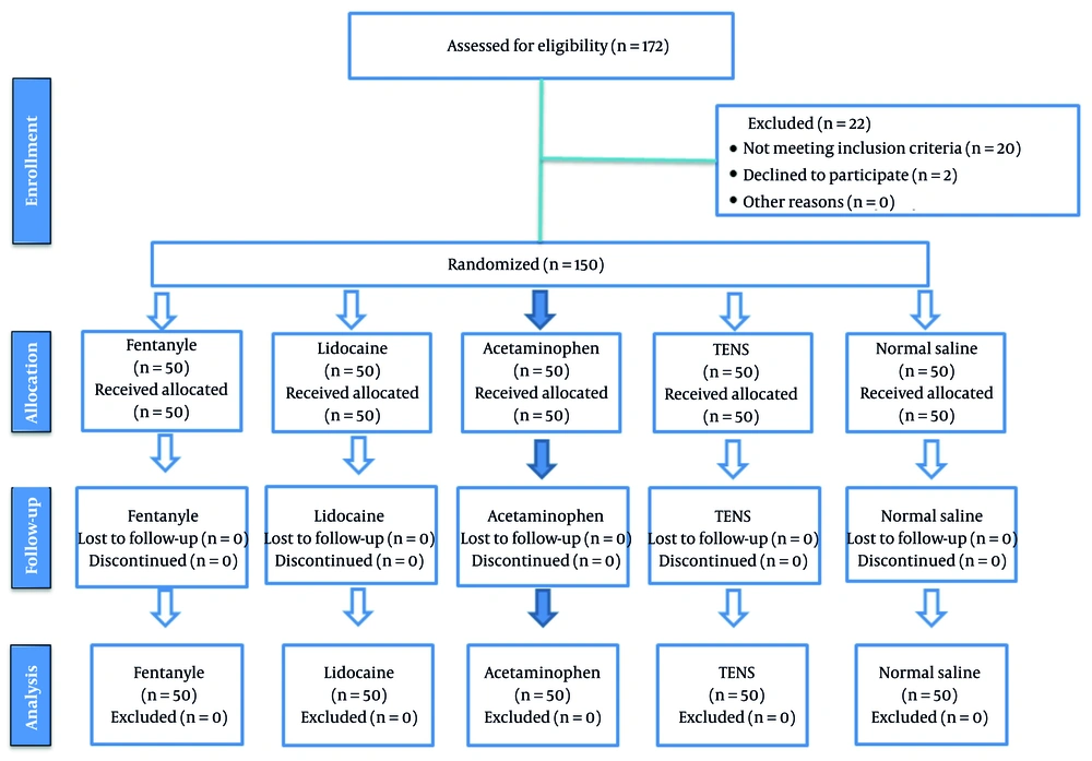 To ensure the infusion volume was similar for everyone, the five groups received their assigned intervention as follows: The control group received 100 mL of normal saline; the lidocaine group received 0.025 mL/kg of lidocaine, plus enough normal saline to make a total of 100 mL; the fentanyl group received 0.03 mL/kg of fentanyl, plus normal saline to make 100 mL; the acetaminophen group received 0.07 mL/kg of acetaminophen, with normal saline added to make a total of 100 mL; the TENS group received 100 mL of normal saline. All patients were prepared for surgery according to standard procedures. An individual not involved in the study applied transcutaneous electrical stimulation to the TENS group 10 minutes before administering propofol 1% (Fresenius Kabi, Germany). We used a TENS device (EM 80 model, Beurer) with 45 × 45 mm adhesive electrodes. The electrodes were placed 5 cm beyond the site of intravenous cannulation, in the cubital region. All patients had two electrodes applied. The TENS group had the device turned on, while the other groups had it turned off. To maintain the blinding effect, the device was covered after it was turned on or off. The TENS settings were a pulse width of 200 μs and a frequency of 100 Hz, with intensity adjusted to produce a tingling sensation without pain, as reported by the patient.