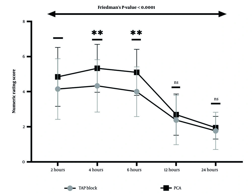 Trend and comparison of pain intensity based on the numeric rating score (NRS) between two groups: Patient-controlled analgesia (PCA) and transversus abdominis plane (TAP) block, at 2, 4, 6, 12, and 24 hours after cesarean section (CS). The Mann-Whitney U test showed that pain intensity was significantly higher at 4 and 6 hours after CS in the PCA group than in the TAP block group (** P < 0.01). In comparison, no significant difference was observed in pain intensity between the two analgesic methods at 2, 12, and 24 hours after surgery. Friedman's test reveals that the intensity of pain at each measurement time in both groups differs significantly from that at other times (Friedman's P-value < 0.0001 for both groups).