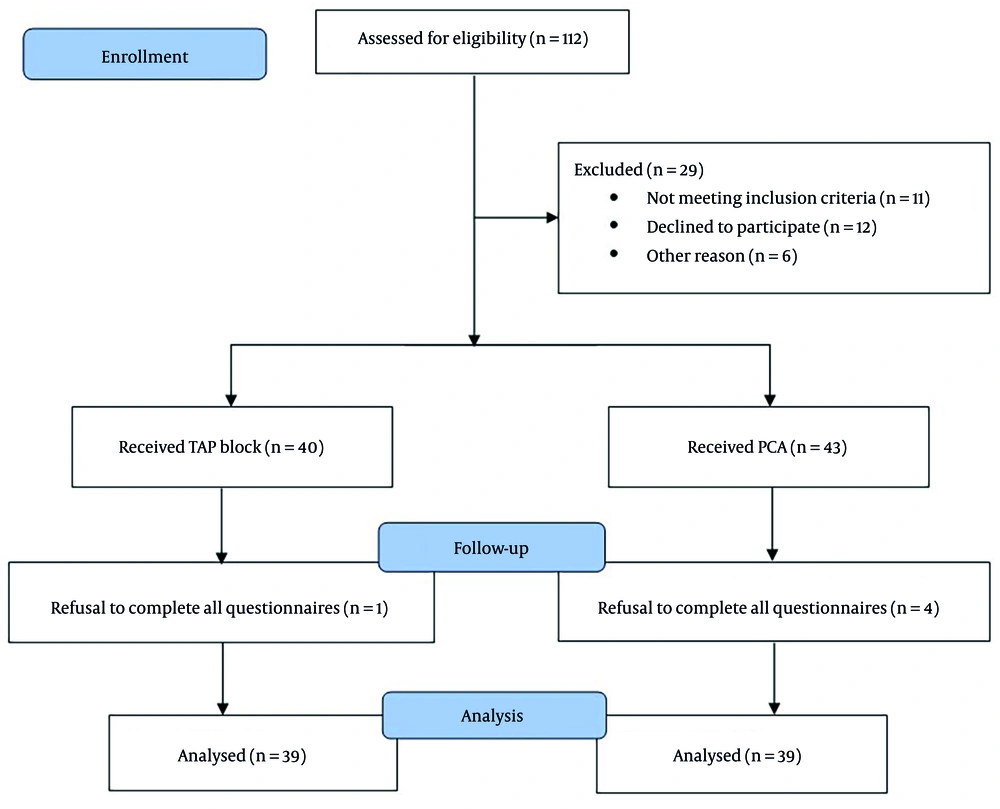 The sample size was calculated based on the findings of Salem et al. (10) and using G*Power (version 3.1.9.4). The calculation was based on the mean difference of pain intensity two hours after CS between two groups of women who had received a TAP block or IV PCA for analgesia. After accounting for a 20% attrition rate, the final sample size was 78 participants, with 39 women per group (effect size: 0.830, α: 0.05, β: 0.1). All procedures performed during this study were part of the treatment process, and participants did not receive any additional interventions before, during, or after the CS.