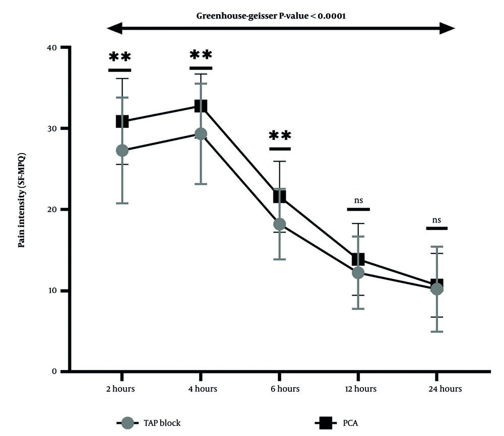 Trends and comparison of pain intensity based on Short Form McGill Pain Questionnaire (SF-MPQ) between two groups of patient-controlled analgesia (PCA) and transversus abdominis plane (TAP) block at 2, 4, 6, 12, and 24 hours after cesarean section (CS). At 2, 4, and 6 hours after CS, pain intensity was significantly higher in the PCA than in the TAP block group. All pairwise comparisons between the two analgesia groups were performed using independent t-tests (** P < 0.01). Repeated-measures ANOVA reveals that pain intensity at each measurement time in the two groups differs significantly from that at other times (Greenhouse-Geisser P-value < 0.0001).