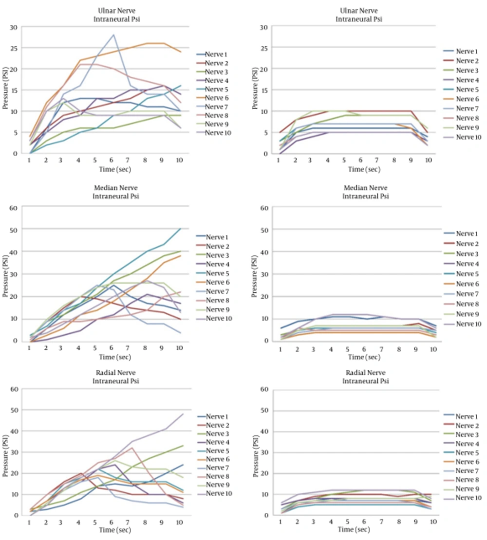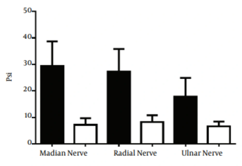 The obtained results demonstrate a statistically significant difference between intraneural and perineural injection pressures in the median, ulnar, and radial nerves in soft-preserved cadaveric tissues. Additionally, considerable variation between the intraneural injection pressures of the ulnar nerve was discovered in comparison to the radial and median nerves. For six out of ten ulnar nerves intraneural injections, the injection pressure was < 20 psi. The present investigation confirms previously identified positive correlations between increased injection pressures and intraneural placement (13, 18, 20). Orebaugh et al. (17) conducted a study in which unembalmed cadaveric nerve roots were injected intraneurally at the C6 and C7 level and the pressure of injection as well as the spread of the injected materials was recorded. Their results’ were in concordance with our findings and showed that intraneural needle placement produces an elevated injection pressure with a mean time to peak injection pressure of 10.3 ± 3.3 seconds. Their values, however, were significantly greater than ours were (mean of 48.9 vs 24.9 psi). The most likely explanation of the difference between our studies results involves the histologic variation between the peripheral nerves and the cervical roots with respect to fascicle number and size and the amount of connective tissue within the nerve. USG commonly shows a different appearance between hypoechoic (black appearance) proximally to hyperechoic (honeycomb appearance) distally in peripheral nerves (9). The histologic variation in peripheral nervous structure has recently been demonstrated by Reina et al. (21) and offered as an explanation for the sporadic severity and range of nervous damage following intraneural injections in RA. Although histologic microscopic examinations determining the exact needle position within the nerve (whether intrafascicular or extrafascicular) were not conducted, the contraindication of advancing a needle beyond epineurium (9, 10) made this unnecessary. The pressure monitoring device used in their studies was PV350 (Fluke Corporation, Everett, Washington), which is a pressure/vacuum transducer and differs to the CDS device used in our study, which is used to measure injection pressures during intradiscal injections. A probable explanation for the difference in magnitude of the opening injection pressures is that the greater values were achieved in their study though the use of a greater injection rate and volume of fluid. Orebaugh et al. (17) used 5 mL of fluid with a rate of 5 mL per 15 seconds (0.33 mL/sec) in comparison to 1 mL of NaCl with a rate of 0.1 mL/sec in our study. Introducing larger volume with faster rate into an enclosed space, such as the cervical nerve roots, might explain the greater increase in pressure. The embalming of cadavers with phenol and glycerol in comparison to unembalmed cadaveric tissues might also be an important factor. The data also showed considerable variation between the ulnar nerve intraneural injection pressures in comparison to the radial and median nerves. This might suggests some histologic differences between the epineurium, intrafascicular, and extrafascicular anatomy between these nerves. The authors acknowledge this to be an area that warrants further investigation. We have chosen median, radial and ulnar nerve for our initial studies for various reasons; first, it is common in our institution to supplement supraclavicular/infraclavicular/axillary block with abovementioned nerves depending on required field of surgery to reinforce and speed up block onset. Second, at the investigated level, nerves are in isolation, clearly identified on USG, and can be blocked selectively. Third, all three nerves were easy to dissect at the described position. We admit that nerve structures at location such as cervical roots, trunks, divisions, cord, and nerves of lumbar and sacral plexus such as femoral and sciatic are subject of our next investigation to produce “map of injection pressure“. One of the main limitations of our study was that the results were obtained from soft embalmed cadavers, which might not reflect the rigor of the human tissues. Additionally, the current study injected 1 mL of 0.9% NaCl at a rate of 0.1 mL/sec for 10 seconds. The 1-mL volume was chosen as it is common in clinical practice to inject 1-mL aliquots to assess the visible spread and rely on assistant/device feedback measuring resistance to injection. Chan et al. (22) confirmed that USG is able to detect 1 mL of injected material. We are aware, however, that this injection rate was much slower than usual clinical practice and the injected volume was much lower. It has been chosen deliberately hypothesizing that if we were able to prove statistically significant difference between intraneural and perineural pressure injection of such a small volume and rate, it would be even more significant for higher rates and volumes. We consider it rather as a strength and not weakness of our study. In their study design, Hadzic et al. (14) injected 4 mL of 2% lidocaine at the rate 1 mL per 15 seconds (0.66 mL/sec). In another study, the rate of injection created by anesthetists during simulated nerve block was recorded as between 2 to 6 mL/sec (23). The most recent conducted animal studies have contradicted the association between increased injection pressures and intraneural needle placement. Lupu et al. (16) used the open model of the porcine median nerve and direct needle placement to inject up to 20 mL of 2% lignocaine with 5 μg/mL (1: 200.000) adrenaline or until an extraneural leakage was seen on USG. The injection of local anesthetic induced histologic evidence of inflammation in seven out of ten swine; however, none of the specimens exhibited functional neurologic deficits. The mean value obtained for the intraneural injections was 5.1 ± 2.9 psi. Altermatt et al. (15) conducted a similar study in which, 4 mL of I