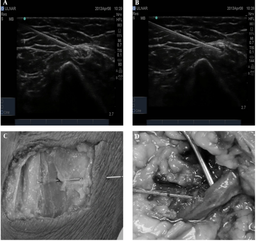 We defined opening injection pressure as the pressure peak that followed the initiation of the injection. Most of the injections produced a similar pattern of a low initial pressure, increasing to a maximal “peak pressure” (opening injection pressure) and ended in a lower pressure. Some injections did not reach peak value within ten-second injection time. The CDS device was utilized as it is known to deliver precise pressure recordings in provocative discography: volume accuracy of 0.05 mL, pressure accuracy of ± 5%, and flow rate accuracy of 1.1% as per Operation/Service Manual (19). The NeuroTherm CDS system employs a syringe pump that delivers media in a controlled fashion, a syringe with an integrated pressure transducer, and a piece of software that allows the calculation of the pressure at the tip of the needle by accounting for the fluid dynamic variables between the transducer and the tip of the needle. The calculated pressure is displayed on the CDS screen. Data was recorded using a computer-based data acquisition system (LabView, USA). In this study, encountered fluid dynamics were described using the Navier-Stokes equation, which took the key variables affecting fluid behavior into account. The key variables were fluid viscosity (cP), flow rate (mL/s), needle length (cm), needle gauge (ga), tubing length, and tubing diameter. To detect any difference in terms of needle length, we measured the baseline (needle open to air) pressure of injection of 1 mL of 0.9% NaCl at a rate of 1 mL in ten seconds with 22-G needles of consecutively 100-mm, 80-mm, and 50-mm lengths as these needle lengths are routinely used clinically. The tubing length was kept the same in each case. The present investigation chose the 80-mm needle as it was most commonly used in clinical practice in our institution. Peripheral nerve block of median, ulnar, and radial nerve, selectively or in combination, often follows immediately infraclavicular brachial plexus block to speed up onset in desired distribution. Needles were left in situ after completing the injection and recording of injection pressure. The cadavers were subsequently dissected to confirm needle placement. The dissections confirmed needle placement and are illustrated together with the USG images in Figure 2. All injections were performed by main investigator (AK) with more than eight years of experience in USG-guided interventions. Injection pressures were recorded on CDS device by DD (David Drew - Operator of CDS device (AK) being blinded to the needle position. All dissections were performed by MS and AV. The data was statistically analyzed using paired-samples t tests to compare the intraneural and perineural values obtained from the same nerves. Significance was assumed at P < 0.05. All statistical analyses were conducted using GraphPad (version 6, USA).