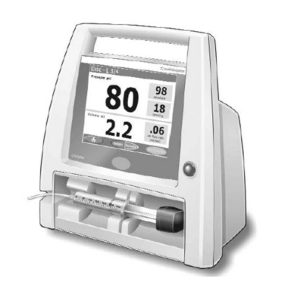 All of the cadaveric tissues were obtained and utilized in accordance with the Human Tissue Act (2004), which includes first person consent for cadaveric investigation. Cadaveric preservation involved the use of phenol and glycerol rather than formaldehyde, which allowed similar tissue mobility as in vivo conditions. A total of 60 injections were conducted using 12 cadaveric arms from six cadavers. Five cadavers were initially provided to perform bilateral radial, median, and ulnar nerve injections (30 intraneural and 30 perineural). In one cadaver, the radial nerve could not be identified on one side and in another one, an ulnar nerve injection measurement was missed due to investigator’s error. As such, an extra cadaver was used to complete the sixty injections. In total, 20 injections were conducted for each of the radial, median, and ulnar nerves (10 intraneural and 10 perineural). All injections were performed at the level of the distal arm. Radial nerve was localized at the anterior compartment of the arm after leaving spiral groove between brachialis and brachioradialis muscle and before division into deep and superficial branch. Median nerve was identified medial to brachial artery in the antecubital fossa. Ulnar nerve lies most superficially under the skin, in compare to radial and median nerve, cranially to the medial epicondyle. An M-Turbo USG system (Sonosite-Fuji Inc, Bothell, WA, USA) was used with a linear 6 to 13 MHz transducer L-38 for needle placement. After identifying a cross-sectional view of the nerves at the described level, an 80-mm, 22-G needle (Sonoplex, Pajunk, Melsungen, Germany) was inserted using an in plane technique. The perineural injection was performed within 1 mm to the epineurium as per standard peripheral nerve block to ensure free flow of solution. For intraneural injection, the needle was inserted into the clearly identifiable nerve structure as seen on USG and according to the current understanding of the concept (3). For intraneural needle placement, once the needle passed the epineurium, USG assessment could not differentiate between extrafascicular (interfascicular epineurium, perineurium) or intrafascicular needle placement (endoneurium, axons). USG images of both perineural and extraneural needle position were captured and stored. Solution spread for perineural injection and nerve swelling (change in cross-sectional area) for intraneural injection were not recorded as a video clips due to a small volume of injection (1 mL) and with the assumption that it would not add value to the investigation. After needle placement, 1 mL of 0.9% NaCl was injected over ten seconds (0.1 mL/sec) and the opening injection pressure was recorded in psi using a Controlled Disc Stimulation (CDS) device (Controlled Disc Stimulation, NeuroTherm, Middleton, MA, USA) (Figure 1).