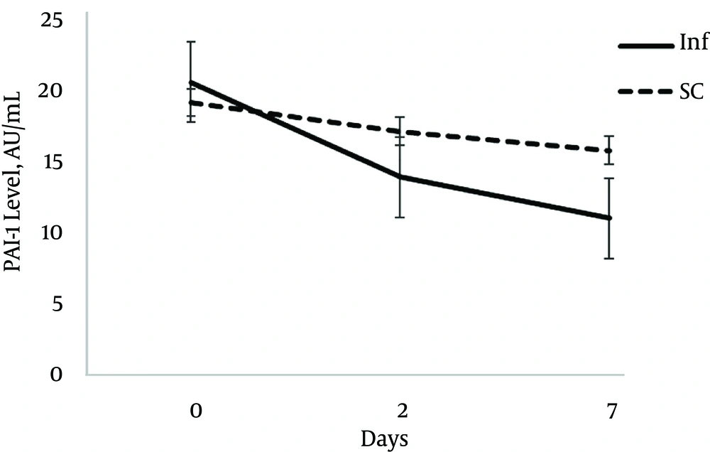 In our study, the plasma PAI-1 level decreased in both study groups; however, it was more rapid in the infusion group. The difference between the two groups increased gradually and it became significant at day 7. This result is consistent with findings of other studies in which the PAI-1 level increased early in sepsis and decreased afterward (5, 18). The sustained level of serum heparin provided by continuous infusion may lead to more prominent decrease in PAI-1 as an inflammatory marker. Considering the link between inflammation and coagulation in sepsis, heparin may affect both of these pathways and alleviate the process.