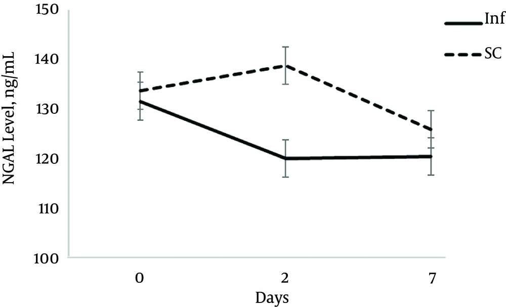 The urinary NGAL level had different pattern. Although two groups were similar at baseline, after 2 days the urinary NGAL level was significantly lower in the infusion group (131.3 ± 11.9 vs. 151.2 ± 20.6; P = 0.014). However, at day 7 the urinary NGAL level was similar in the two groups.