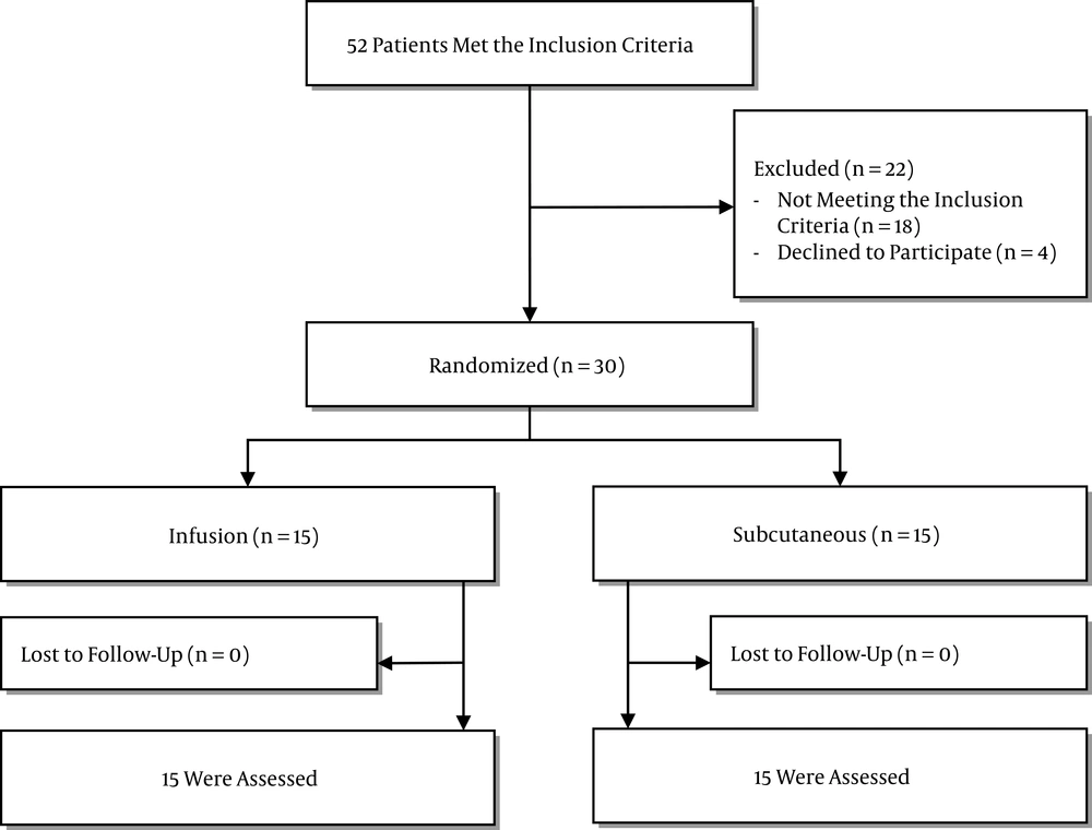 This study was approved by the ethics committee of Tehran University of Medical Sciences and a written informed consent was obtained from the patients or from the family members (IRCT2015071122668N1). This prospective, randomized controlled trial was conducted in a 32-bed intensive care unit (ICU). Patients aged 18 years old or greater who were diagnosed with sepsis were enrolled. The diagnosis of sepsis was made according to “surviving sepsis campaign: international guidelines for management of severe sepsis and septic shock” (10). Exclusion criteria were pregnancy, increased risk for bleeding, requirement of anticoagulation, transplantation, PLT < 50 × 106 per mL, history of HIT, allergy to heparin, and acute and chronic kidney injury. Thirty patients were included in the study and assigned randomly to the infusion group to receive 500 units of heparin per hour or the subcutaneous group to receive 5,000 units every eight hours. The total daily dose of heparin in the infusion group was 12,500 units and in the subcutaneous group was 15000 units and both continued for 7 days or until discharge or death if these occurred before. Other managements were based on latest guidelines and clinical judgment.