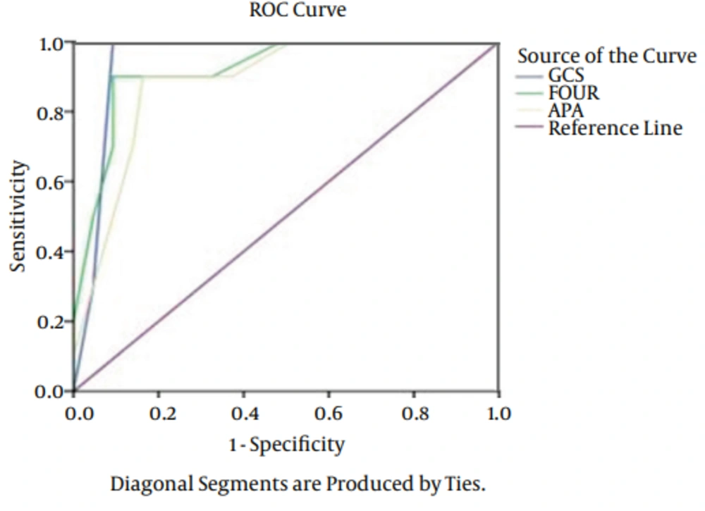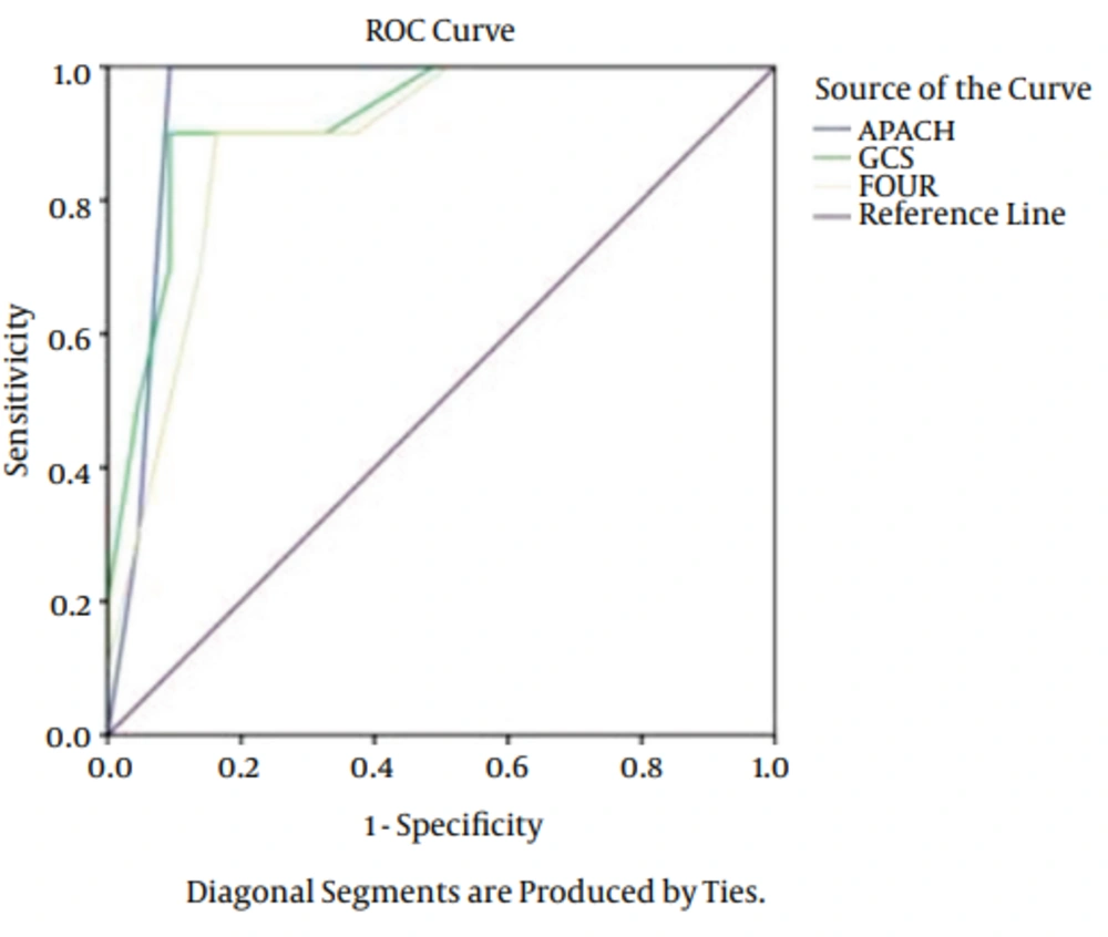 Traumatic brain injury (TBI) is one of the serious causes of mortality and disability worldwide, and it is estimated that annually about 1.5 million people die and millions of them need to emergency care because of TBI. The mortality rate after TBI depends on the intensity of injury and mechanism underlying the trauma although adverse outcomes may reach 120 percent (1, 2). Wide cognitive and physical disability and a high TBI-related mortality rate interested the researchers to explore the ways of diagnosis and prognosis of this problem in order to proceed for better prevention strategies (3, 4). Today, determination of mortality and complications among patients admitted to intensive care units (ICUs) is one of the research priorities (5). Considering the cost and limitations of beds in ICU, it is very critical to determine the status of a patient in order to accept the most urgent patients (6, 7). Therefore, the personnel should select the patients who need urgent critical care on time, through appropriate tools (6, 7). Categorization of the severity of disease helps to judge about the treatment process, according to their demands and hospital facilities (8, 9). Considering critical situation of TBI patients for appropriate treatment (10, 11), there are several existing tools to estimate the hospital’s mortality rate of these patients in ICU (12). Glasgow coma scale (GCS) is the most common clinical tool for primary determination of TBI (13). Several researches have shown the efficacy of GCS in prediction of mortality and morbidity (13-16). However, GCS is an appropriate tool to determine the severity of TBI, but still includes some limitations (13-18). Therefore, other tools also designed during time, for example, Wijdicks et al. (19) invented a tool named full outline of unresponsiveness (FOUR) in order to overcome on the limitations of GCS. This tool provides information about brainstem reflex follow-up eye and respiratory patterns, which is ignored in GCS. The FOUR measures different stages of brain herniation and locking syndrome. In addition, FOUR can assess patients in the critical condition because it does not need verbal ability (20, 21). The appropriate relation of FOUR scores and outcomes was surveyed in several studies (22). In the last two decades, several researchers suggested designing more efficient tools (23, 24). Acute physiology and chronic health evaluation (APACHE II) is one of the suggested tools, it has been used worldwide since 1985 as a physiological parameter (25). Some studies compared APACHE with GCS and other related tools (23-26). However, the result of some researchers suggested that APACHE II is not efficient in patient’s undergone neurosurgery (23-27), but comparing the three tools (APACHE II, APACHE III and GCS) showed similar outcome predictions (28). In another study, comparison of GCS and APACHE II in patients with head trauma revealed GCS is better than APACHE II in prediction of outcome of head trauma; however, APACHE II is better in predicting the outcomes of other traumas (25). Glasgow coma scale was also compared with FOUR and findings indicated same efficacy (22-29).