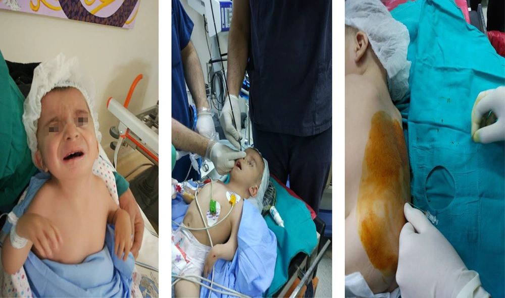 FSS, also known as cranio-carpo-tarsal dysplasia and whistling face syndrome, is a rare congenital myopathy disorder first reported in 1938 and characterized by malformations of the face, oral cavity, and musculoskeletal system (1). Common facial features include microstomia, microglossia, a high arched palate, hypoplastic mandible, and a short neck with relatively limited mobility. The combination of abnormal facial characteristics makes direct laryngoscopy and orotracheal intubation difficult or impossible (2). According to the literature, the most frequent challenge during anesthesia is difficult intubation. Studies also reported that FSS can be related with muscle rigidity, pyrexia, and malignant hyperthermia, however, these findings have not been confirmed (3, 4). Our patient was a 22-month-old with Freeman-Sheldon syndrome (FSS) scheduled for web-plasty in the prone position. The male patient weighed only 6.5 kg and had dysmorphic features (Figure 1), with retrognathia, microstomia, microglossia, a high arched palate, a hypoplastic mandible, ulnar deviation of fingers, bilateral congenital talipes equinovarus, and knee dislocation. Intubation had been unsuccessful on two previous occasions due to the presence of the aforementioned anomalies associated with FSS. Given the patient’s history of unsuccessful intubation and the need to perform the surgery in the prone position, we chose fiberoptic-assisted nasotracheal intubation, with the patient sedated but maintaining spontaneous respiration. In addition, spinal anesthesia was administered to prevent postoperative pain. The procedure was explained to the parents and they provided signed informed consent for a combination of regional and general anesthesia. Pre-operative chest radiography, electrocardiography (ECG), hematological and biochemical investigations, baseline vitals recorded using ECG, pulse oximetry, and noninvasive blood pressure were normal. A skin temperature probe was placed after intubation. Anesthesia was induced via a mask with sevoflurane, oxygen, and nitrous oxide, with gradual increases in concentration every few breaths, up to a concentration of 6%. Upon loss of consciousness, the sevoflurane-inspired concentration was reduced to 2% - 4%. Anesthesia was achieved via incremental doses of 1 mg/kg propofol (Lipuro, Braun, Germany) administered intravenously. Spontaneous respiration was maintained during the induction of intravenous (i.v.) anesthesia.