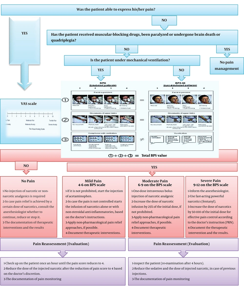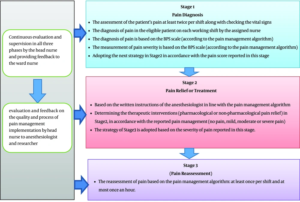 In the intervention phase, two-day workshop training was held on comprehensive pain management. At the beginning of the workshop, lectures on the physiology and importance of pain management were presented. The researcher, then, introduced the main stages of comprehensive pain management, the method of using the pain management algorithm, and the implementation process of the management program. At the end of the workshop, a hypothetical scenario of a patient's condition was presented to small groups, and nurses were trained in implementing the pain management algorithm concerning the presented scenario. In the end, each of the groups reported how they managed pain and challenges, and the researcher discussed and summarized the results and made the final conclusion. In addition to oral training, educational packages were provided to all participating nurses. This package included a pain management booklet, a small poster of the pain management algorithm, and the behavioral pain scale (BPS). Moreover, before the intervention phase, a description of the tasks of the members involved in the implementation was given (supplementary file Appendix 1). In addition to installing the documentation of job description and a poster explaining the pain management algorithm and the process of program execution, oral notices were also made by the head of the ward for all nurses and participants involved in the research. Accordingly, the nurses and other members of the treatment team were asked to manage pain in eligible patients. Eligible patients were aged between 18 and 70 years, their levels of consciousness were 7 to 11 based on the Glasgow criteria (11-7), received no muscle relaxants (no paralysis), and had not self-reported pain and malignancy. Moreover, they would not have the experience of being hospitalized in surgical services.