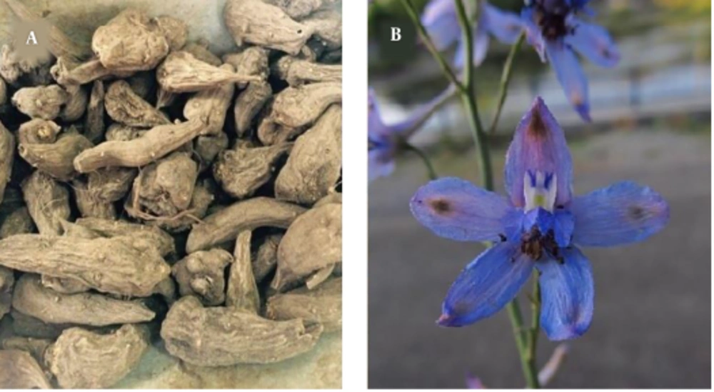 Delphinium denudatum Wall. (Ranunculaceae), also known as Jadwar (Mah-Parvin in Persian) (Figure 1), is a medicinal herb with various properties (6). In PM, Jadwar has been used as a tonic agent for increasing mental and physical stamina in addition to its usage as poison detoxification and a pain-relieving drug (7).