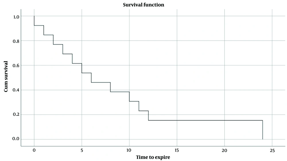 Within the follow-up period, 43.3% (n = 13) of the patients expired. The Kaplan-Meier diagram of the study revealed a mean survival time of 8.4 ± 2.1 months within the 2-year follow-up (Figure 1), with a median of 6.0 ± 2.3 months.