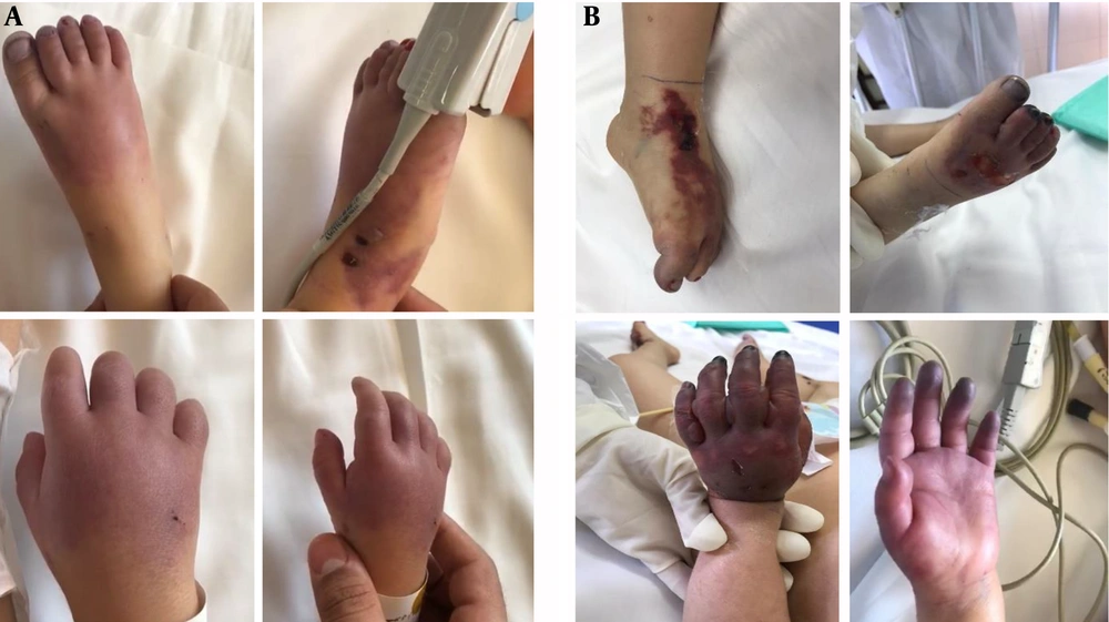 On physical examination, her pulses were not detected. Thus, her blood pressure could not be measured. The patient's respiratory rate was 38 per minute, and the temperature was 38.2°C. Her arterial oxygen saturation was 74% in room air. The patient was lethargic and had a decreased level of consciousness. The patient's height and weight were 90 cm and 8 kg, respectively. Some ecchymotic lesions were all over the body, especially in sites where blood was drawn. Both hands and feet were cold, pulseless, mottled, and covered by ecchymosis, particularly in more distal parts (Figure 1). Her fingers were cyanotic, and capillary refill time was delayed for more than 3 seconds. No other abnormal signs were detected in physical examination. Table 1 showed the laboratory data of the patient.