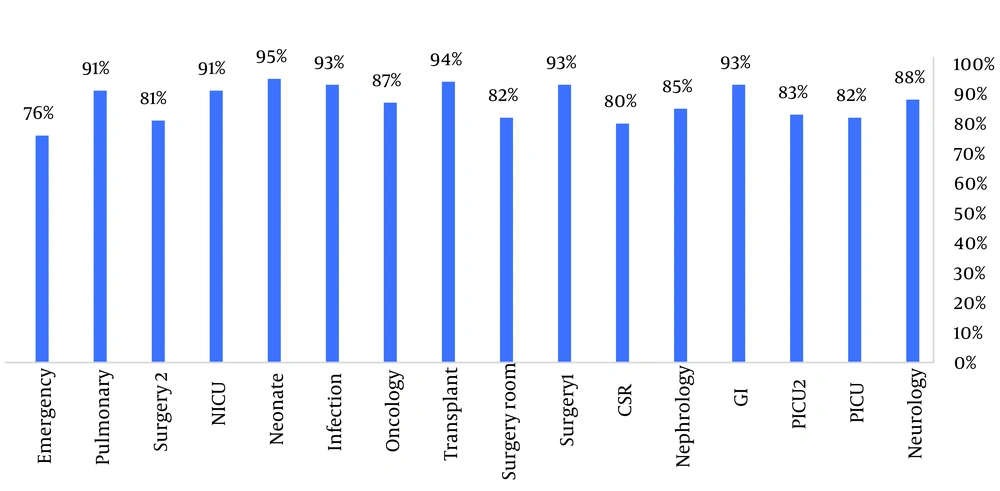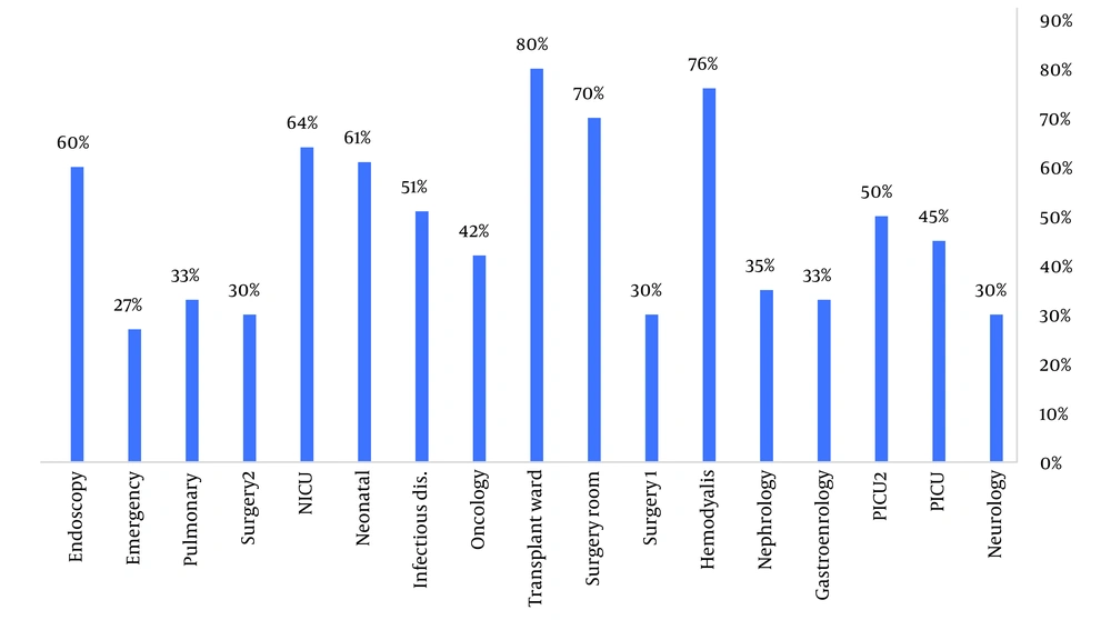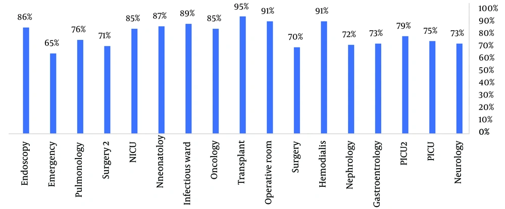 Compliance rates across various hospital wards showed that the transplantation and hemodialysis wards had the highest compliance levels at 80% and 76%, respectively. In contrast, the emergency ward demonstrated the lowest compliance rate at 27%. All data are presented in Figure 2.
