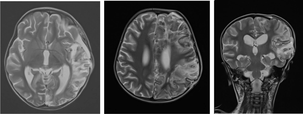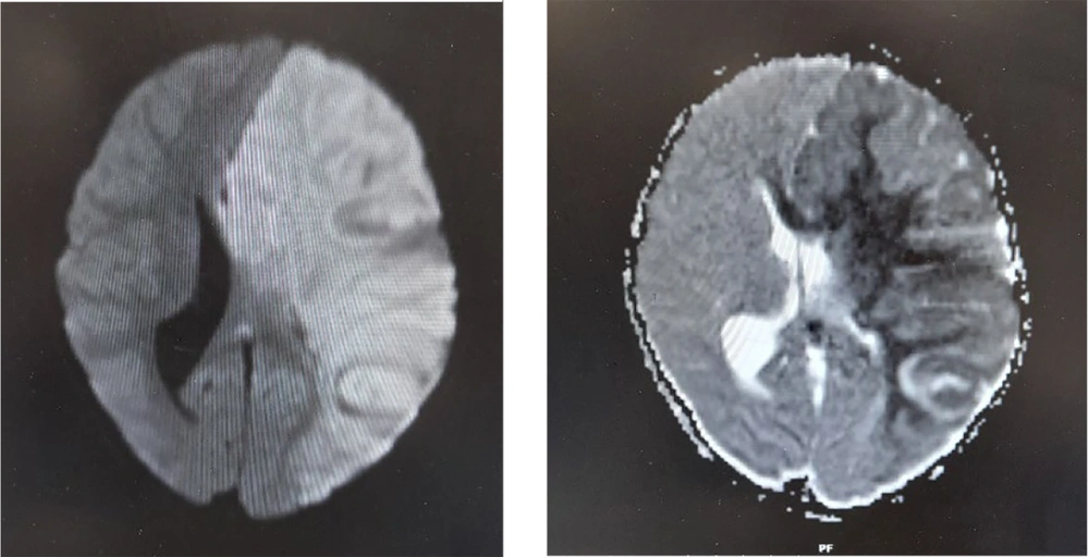 COVID-19 is typically a mild or asymptomatic disease in children, but some children with underlying conditions are at increased risk of severe disease. Although children without underlying medical conditions can experience severe illness (1). Based on data reported to the WHO between December 30, 2019, and September 6, 2021, children under 5 years old were a very small number of the under 24 years old cases, about 1.8% of global cases; the 5 - 15 years and 15 - 24 years old groups were 6.2% and 14.3% of global cases, respectively (2). According to the MPIDR COVerAGE database (Max Planck Institute of Demographic Research) in Rostock, Germany, 4.4 million deaths due to COVID-19 disease were reported in 2023 from 120 countries. Of these, 0.4 percent (17,400 cases) occurred in children and adolescents under 20 years, with 53% in the 10 - 19 years age group and 47% in the 0 - 9 years age group (3). Neurological involvement is frequent in the pediatric age group, in patients affected by both COVID-19 and, even more, MIS-C. Neurological symptoms and signs are highly heterogeneous. The frequency of certain neurological manifestations varies depending on the patient’s age. Symptoms and signs can even be differentiated in the two groups, COVID-19 and MIS-C, but consciousness impairment is the most frequent manifestation in both groups and may underlie an encephalopathy. The latency of neurologic manifestations was greater in the MIS-C group, so suspicion should remain high in the days after onset. Most neurological manifestations were mild in our series; however, severe complications, such as ischemic stroke and GBS, are noteworthy (4). COVID-19 disease is mild in children, but severe COVID-19, myocarditis, heart problems, Kawasaki disease, MIS-C, and long-term COVID-19 may occur in children, with the probability increasing if there are risk factors. Neurologic complications may occur in 7% of children with COVID-19 and include febrile seizure, afebrile seizure, encephalopathy, brain abscess, bacterial meningitis, and cerebral infarction. The least common complication is cerebral infarction (0.05%) (5). In the USA, 20% of children admitted to the PICU with COVID-19 had heart complications, consisting of arrhythmia, myocarditis, pericarditis, and cardiac vessel vasculitis (6). In this article, a child who suffered from MIS-C followed by COVID-19, myocarditis, and brain complications is reported, and the mechanism and treatment options are discussed.