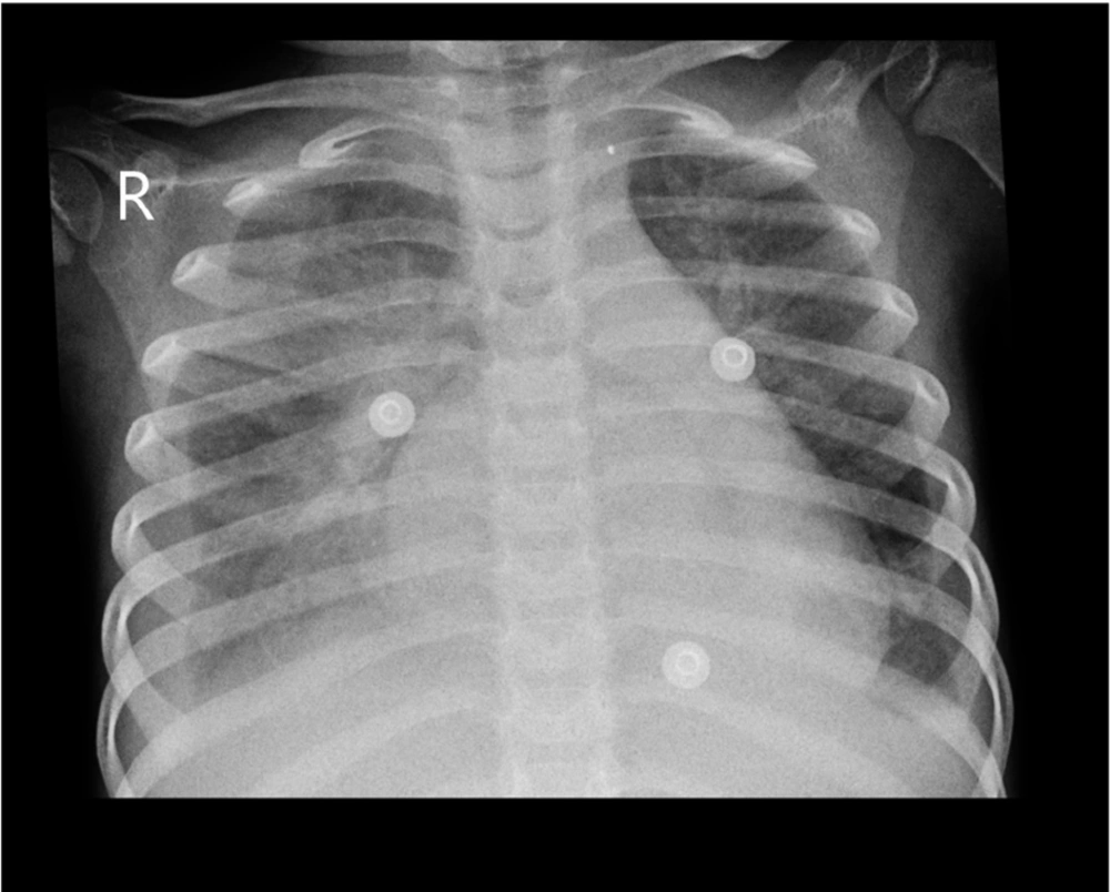 The patient, a 4-year-old girl with no known past medical history, presented with a recent episode of flu-like symptoms and abdominal pain persisting for 12 days without response to oral medications, culminating in severe respiratory distress. The parents denied consanguinity. Upon admission to the hospital, the child exhibited signs of respiratory distress, including tachypnea, decreased oxygen saturation levels, and the use of accessory muscles. Initial assessment revealed pleural effusion on chest X-ray, and after chest tube insertion, massive pleural effusion was observed. Heart sounds revealed a 3/6 murmur. Following chest tube insertion, the patient experienced a further drop in oxygen saturation, necessitating intubation. After intubation, negative pressure pulmonary edema occurred due to non-stepwise and large-volume pleural fluid drainage, presenting with pink foam discharge from the mouth and tracheal tube. Pleural fluid analysis showed cholesterol 9 mg/dL, TG 18 mg/dL, LDH 465 U/L, glucose 170 mg/dL, protein 1480 mg/dL, WBC 4, and RBC 1000 (Table 1). Aerobic and anaerobic pleural fluid cultures were negative.