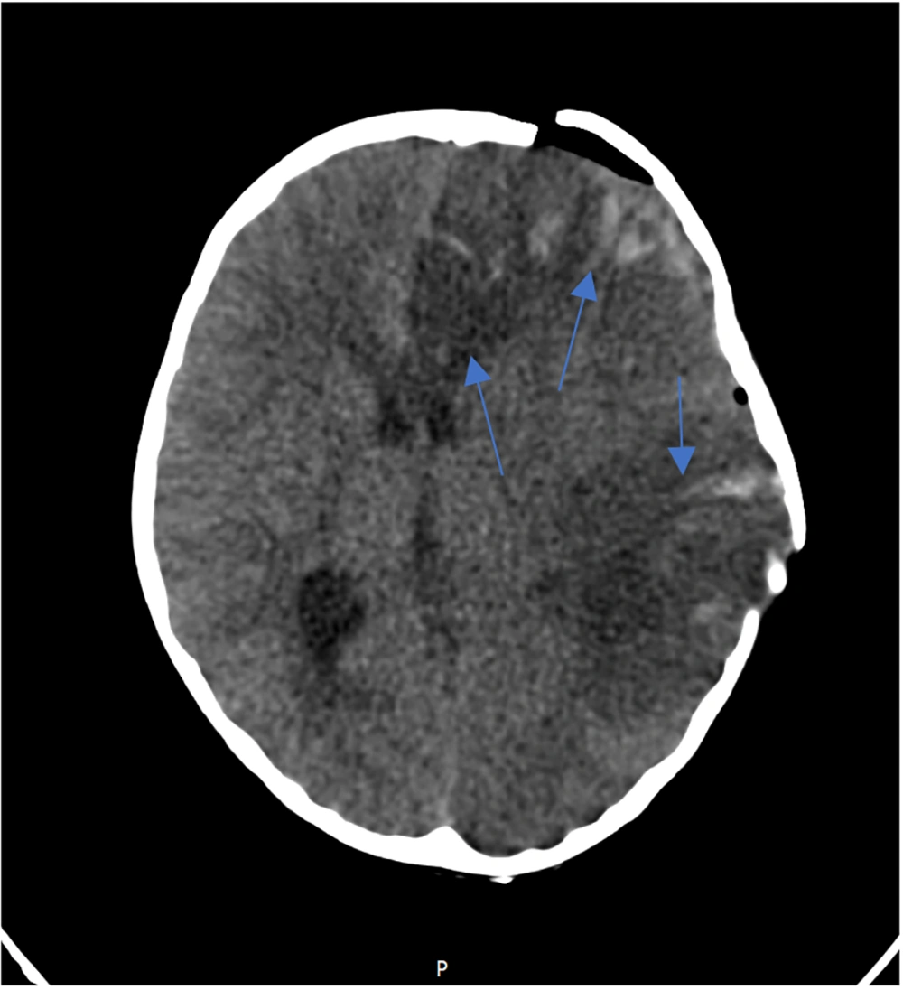 Three days after successful extubation, the patient demonstrated abnormalities in limb tone and force, as well as anisocoria. Brain MRI showed severe generalized edema, ischemia, and herniation (Figure 2). Antiepileptic drugs were started due to brain damage. Following a severe increase in intracerebral pressure, a craniotomy was performed, and supportive treatment continued. A brain biopsy showed inflammation and bleeding. MRA (Magnetic Resonance Angiography) showed a filling defect in the right vertebral artery. Post-craniotomy MRI reported mild herniation through the craniotomy site. An abnormal T2/FLAIR high signal was noted in the left cerebral hemisphere, left basal ganglia, and left thalamus as a sequel of infarction. Hemorrhagic changes in the left frontal lobe were seen, with multiple areas of gyral T1-high signal mostly suggestive of cortical laminar necrosis (Figure 3). There were no changes in favor of HSV in the MRI. Post-craniotomy CT scan showed parenchymal edema and hemorrhagic changes in the left frontal lobe, with abnormal hyper-dense foci noted in the genu and splenium of the corpus callosum and left caudate nucleus (Figure 4). The patient was diagnosed with cerebral stroke. CSF PCR for HSV from the brain biopsy, serum HLA B51, IgA, IgG, IgM, IgE, ANA, lupus anticoagulant, TG, cholesterol, HDL, LDL, pANCA, cANCA, anti-coagulant IgG and IgM, anti-cardiolipin IgG and IgM, protein C, protein S, anti-thrombin 3, F-ANA, anti-B2 glycoprotein, anti-DNase, IL-6, and anti-Smith were performed (Table 1).