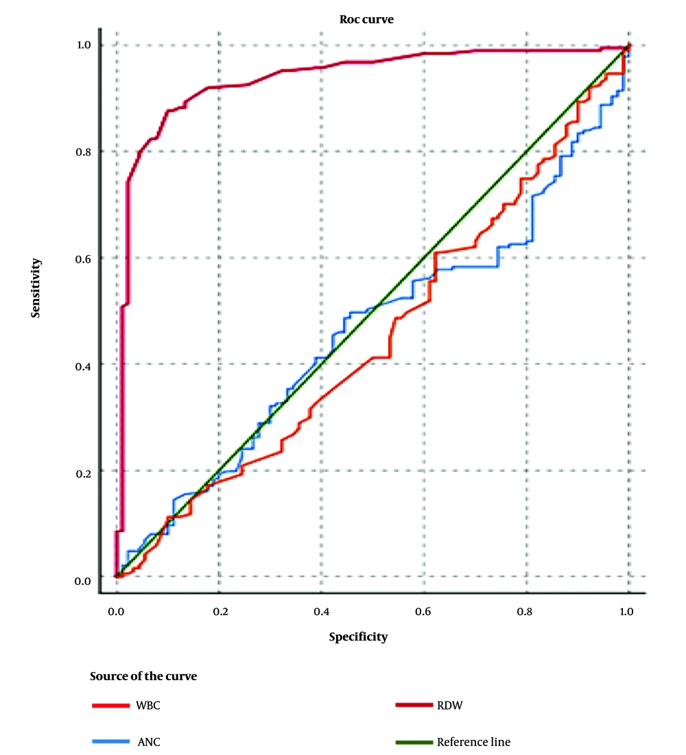 The CBC parameters evaluated in this study include white blood cell (WBC) count, platelet count, ANC, and RDW. The RDW is a hematological index that reflects the heterogeneity in the size of circulating erythrocytes (anisocytosis). This parameter is often considered by clinicians as a differential diagnostic biomarker of iron deficiency anemia and thalassemia (13). The RDW reference interval at birth is reported to be slightly higher than the normal reference range for older children and adults. This reference range does not change physiologically over the first two weeks of life (14). In neonatal sepsis, the acute systemic inflammatory response alters erythropoiesis and erythrocyte maturation, which results in RDW elevation. This increase in RDW level due to macrocytic reticulocytosis may indicate the severity of the underlying inflammatory response and the risk of mortality (15).