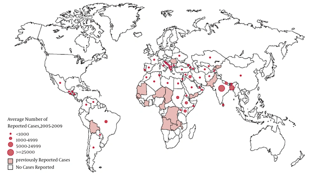 Leishmaniasis mostly occurs in tropical and temperate regions where sand flies are more often found. Disease is endemic in 88 countries (Figures 1 and 2) (4). Annually, about 500,000 new cases of VL and 1 to 1.5 million new cases of cutaneous leishmaniasis occur (5). The estimated incidence of cutaneous and visceral leishmaniasis in Iran is about 42.2 and 0.3 in 100,000, respectively (6).