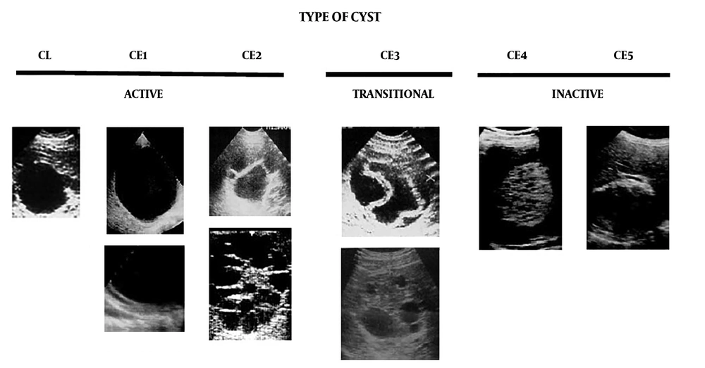 From January 4, 2005 to December 28, 2018, a total 93 children were admitted with isolated form of HCL of type CL-CE2 and with cyst size > 2 cm. There were 61 boys and 32 girls, with average age 9.1 ± 1.8 (3 - 17) years. Patients underwent clinical examination with laboratory diagnostics; serological testing using ELISA with an Echinococcus-IgG-ELISA-BEST reagent kit (D-3356; VECTOR-BEST, Russia); and Doppler ultrasound (US) examination of the abdominal organs using an ARIETTA V60 device (Hitachi Aloka Medical Ltd., Japan) with four linear and convex transducers of 3.5 and 5 MHz. To interpret the US data, we used the international classification of ultrasound images of HCL, approved by the World Health Organization for echinococcosis (5) (Figure 1). Patients were divided into groups, depending on the type of HCL: Group I (CL type) with 27 patients, Group II (CE1 type) with 32, and Group III (CE2 type) with 34.