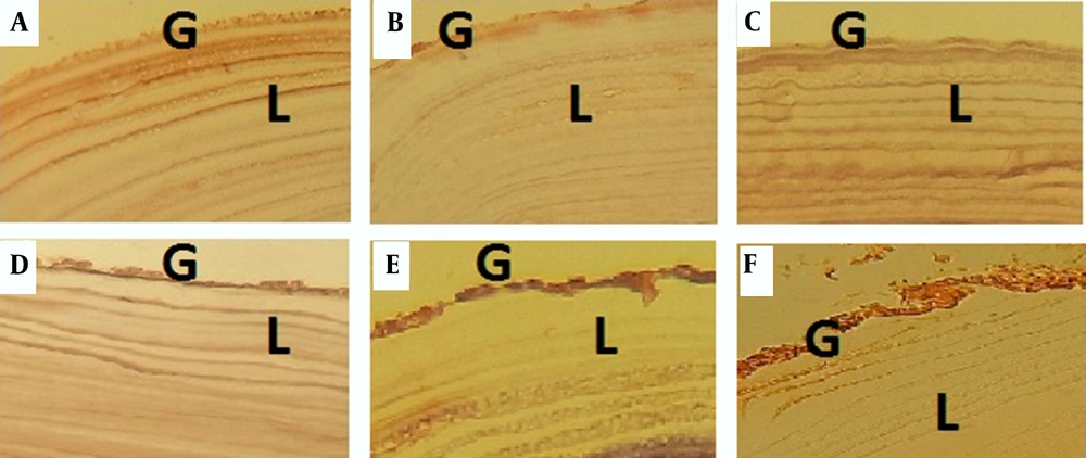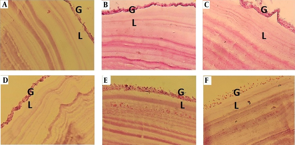 Eventually, a suspension of 9,000 to 10,000 protoscolices/mL was prepared in RPMI. Afterward, suspensions with 90% alive protoscolices were transferred to dark containers and kept at 4°C (12, 13). Following the removal of hydatid cysts, cystic layers, which contained a laminated and a germinal layer, were isolated from the host tissue (sheep). Finally, the layers were washed with phosphate buffer for histological investigations.