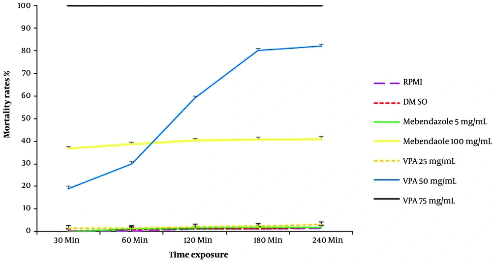 The mortality rates of protoscolices, exposed to RPMI, DMSO, mebendazole (two concentrations), and VPA (three concentrations), are provided in Figure 1. The Mortality Rate (MR) of protoscolices was directly related to the concentrations of mebendazole and VPA and exposure time. Also, high concentrations of mebendazole (100 µg/mL) and VPA (75 mg/mL) led to 36% and 100% mortality of protoscolices within 30 minutes, respectively.