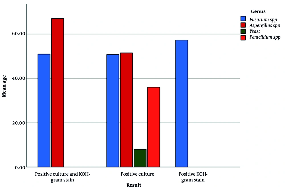 Fusarium species was the most common agent of fungal keratitis over five years in the present study, similar to the study by Lin et al. in 2017, which found Fusarium species in 44.4% of cases and the dominant role of Fusarium is evident in studies (11, 12). In Iran, limited comprehensive studies have been conducted regarding fungal keratitis. In a study by Akbari and Sedighi, Aspergillus spp. and Fusarium spp. were reported as the most frequent pathogens responsible for keratitis in patients in central regions of Iran (6). In similar studies conducted in tropical regions, Fusarium species have been reported as the most common cause of fungal keratitis (13, 14). The dominant role of Fusarium in fungal keratitis is a finding observed in various studies worldwide. For instance, based on research conducted, Fusarium spp. has been identified as the predominant agent of fungal keratitis in countries such as India, Bangladesh, and some regions of Africa (15, 16). A study by Ranjini and Waddepally in India showed that over 70 percent of fungal keratitis cases were caused by Fusarium spp. (17). A study by Kibret and Bitew in Southeast Asia indicated that environmental factors significantly contribute to the increased prevalence of Fusarium spp., which aligns with the findings of this study. Additionally, Aspergillus species, due to their widespread distribution in various environments, can be reported as the most common cause of fungal keratitis, as observed in the study by Binnani et al. (18, 19).