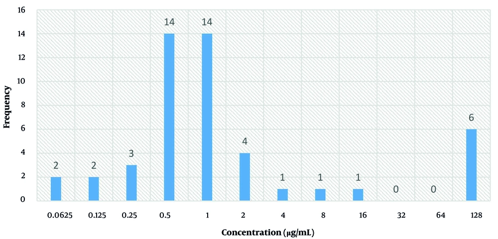 For the 48 clinical isolates, colistin’s MIC was calculated; the findings are shown in Figure 1. The MIC levels ≤ 2 µg/mL are classed as intermediate under the CLSI recommendations (M100, 2025); those with values ≥ 4 µg/mL are deemed resistant. Nine isolates (18.75% of the total MDR isolates included in the study) were found to be colistin-resistant using this definition.
