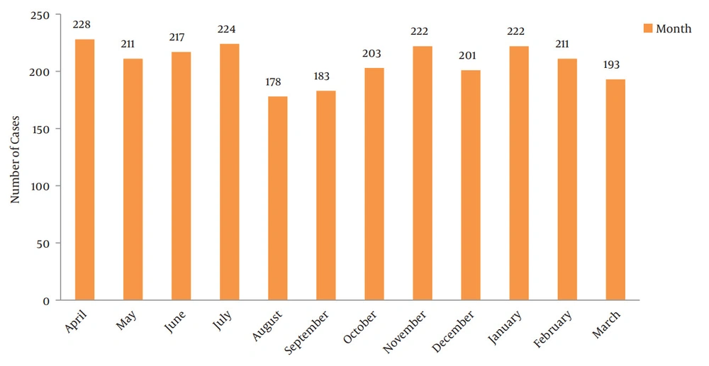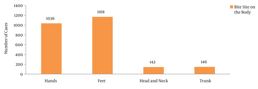 A study conducted by Pandey et al. on tourists and foreign residents in Nepal showed higher prevalence of rabies-infected bites among females than males (14); however, the number of male animal bite victims was higher than females, which is consistent with the results of other studies in Iran concerning the gender distribution of animal bites. For example, males accounted for 76% of animal bite victims in Kerman (Bahonar et al. (15)), 75% in Ardabil (Majidpour et al. (16)), 73.2% in Ilam (Bahonar et al. (6)), 80% in Ahvaz (Kassiri et al. (17)), 77.6% in Shush (Kassiri et al. (18)), and 72.5% in Islamabad-Gharb (Kassiri et al. (19)). It seems that the greater exposure of males to animals, specifically in rural areas, is the reason behind this difference. On the other hand, a study conducted in the United States showed higher prevalence of animal bites among females (20), which is inconsistent with the current findings. This difference can be attributed to cultural differences between the two countries. For example, household pets, typically seen in American homes, are uncommon in Iran.