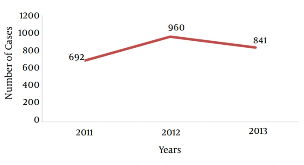 The incidence of animal bites in Eastern Ahvaz had an upward-downward trend during the study period with 2493 victims in total. The incidence of animal bites increased from 104 cases in 2011 to 124 cases in 2013 per 100,000 individuals, placing Ahvaz among the moderate endemic regions based on Tabatabaii et al.’s classification with an incidence of 100 to 300 cases per 100,000 people (4). Moreover, different studies reported an increased incidence of animal bites in different regions of Iran from 35 cases in 1988 to 151 in 2001 per 100,000 people (10). In a similar study conducted by Sabouri Ghannad et al., the incidence of animal bites increased from 34 cases in 1999 to 98 in 2008 per 100,000 people (11). In a study conducted in Rafsanjan in Southern Iran, the incidence of animal bites increased from 180 cases in 2003 to 214 in 2004 per 100,000 people (12). This result is consistent with the findings of the current study. Although the reason behind this increased incidence in animal biting is unknown, it may be due to the increased number of health-medical centers covering a larger population and encouraging more people to visit such centers. Another reason can be an increase in the number of stray dogs (13).