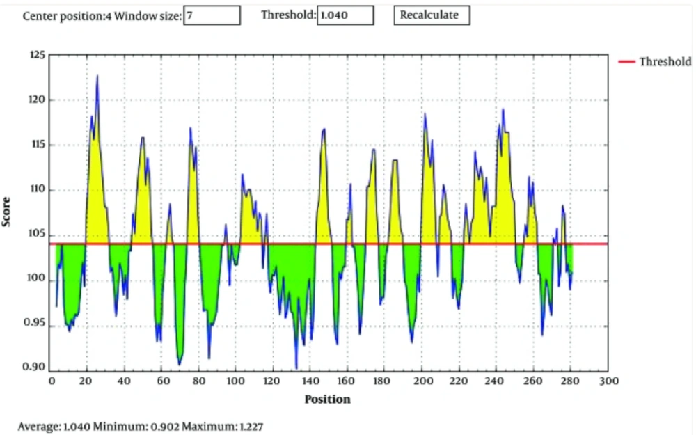 Prediction of B cell binding-epitopes was confirmed using the BepiPred online server from the IEDB online tool according to the Kolaskar and Tongaonkar antigenicity scale (15).
