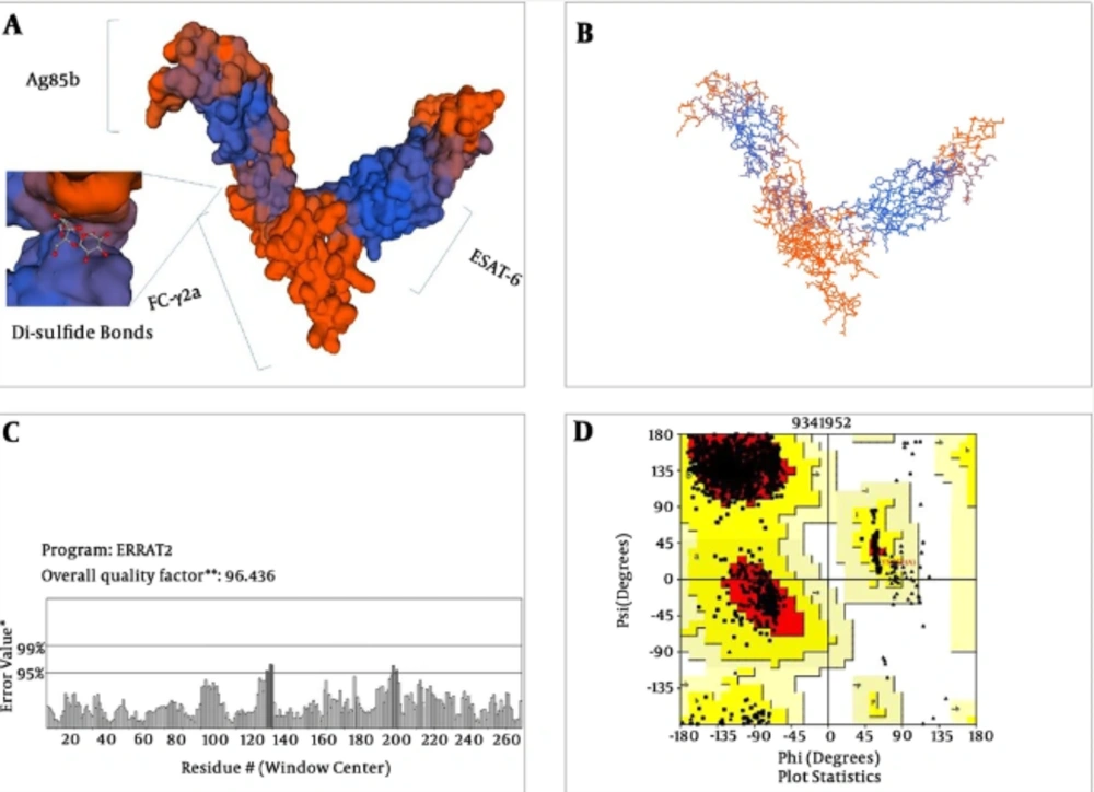 The synthetic gene was converted to dimeric forms, and all the predicted models were evaluated based on a high score rate (GDT_TS score > 60%, ProQ score 1.6, Bit score 120.3 with E value 0.014). Finally, construct stability was confirmed using ERRAT (http://servicesn.mbi.ucla.edu/ERRAT/) and Ramachandran software programs to be 96% and 90%, respectively (Figure 3A-D).